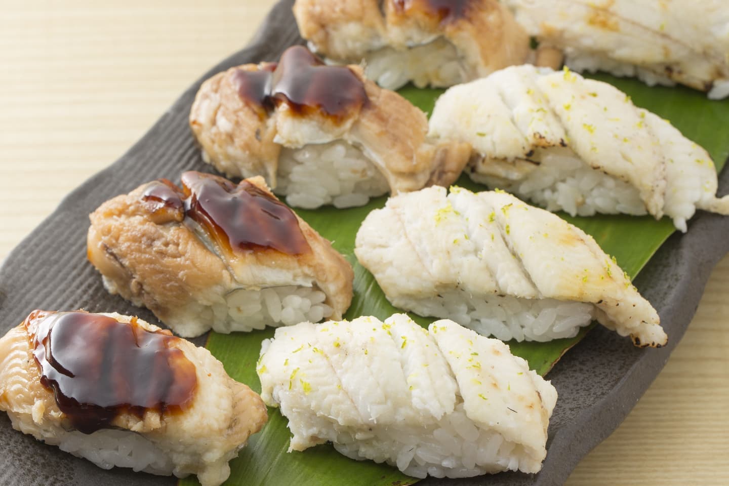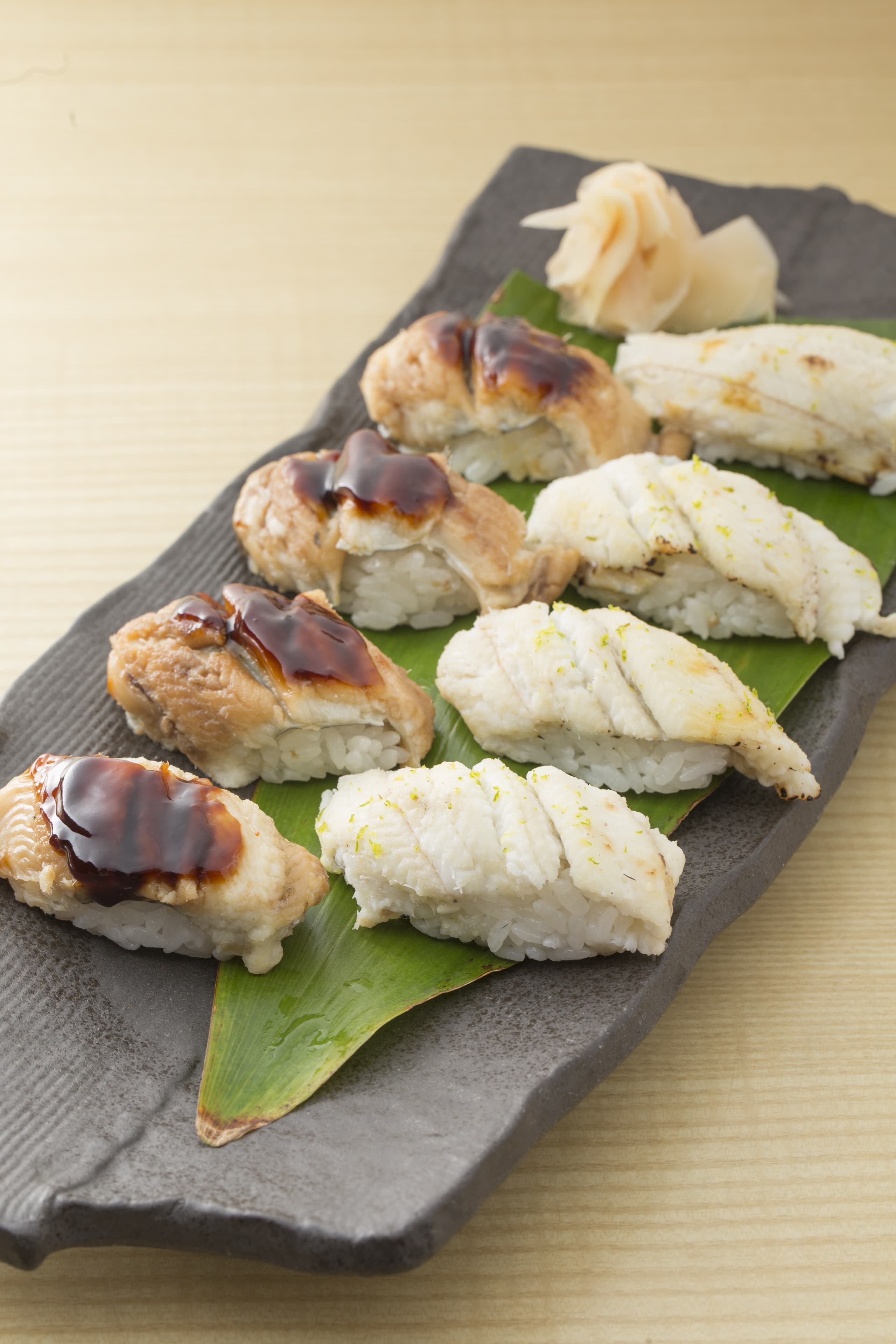 醤油とザラメでコックリと煮て、濃厚な煮ツメが穴子の旨みを引き立てます。
