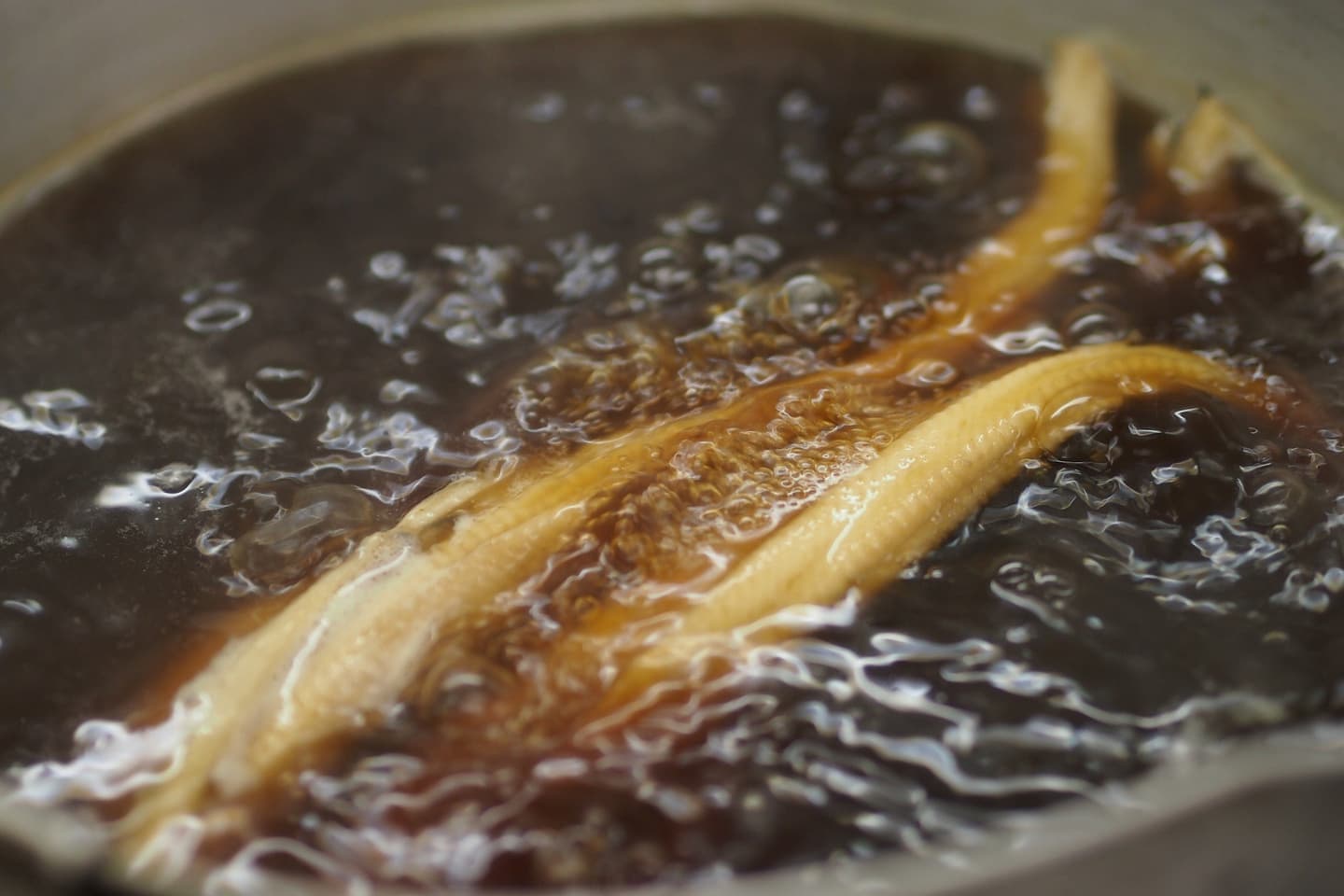 酒と砂糖で煮上げる「沢煮」という技法をアレンジ。香ばしく炙って穴子の風味を引き立てます。ゆずの香りとお塩でどうぞ。