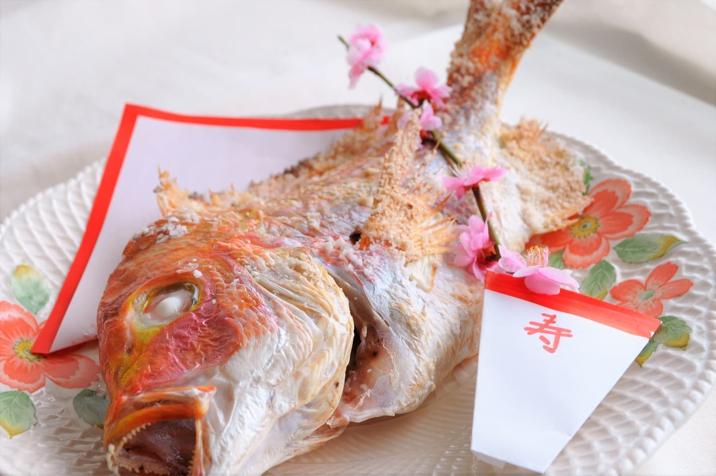 お頭付きの天然真鯛塩焼きをはじめ前菜からお刺身、天麩羅にデザートまで、お祝いの席にふさわしいお料理をご予算に応じてコースをご用意しております。お食い初め用の鯛の塩焼きもご用意いたします。