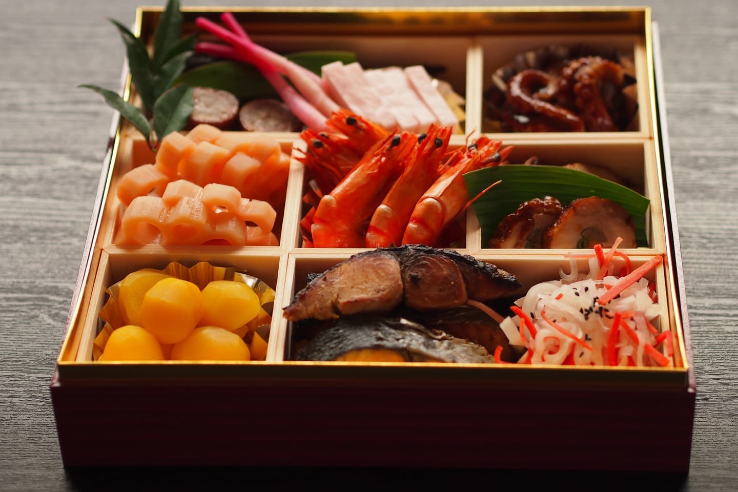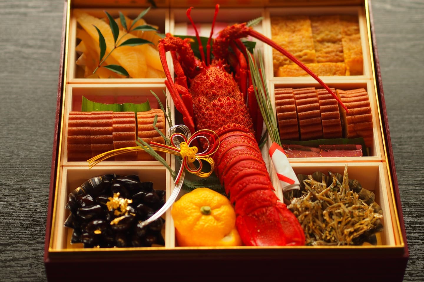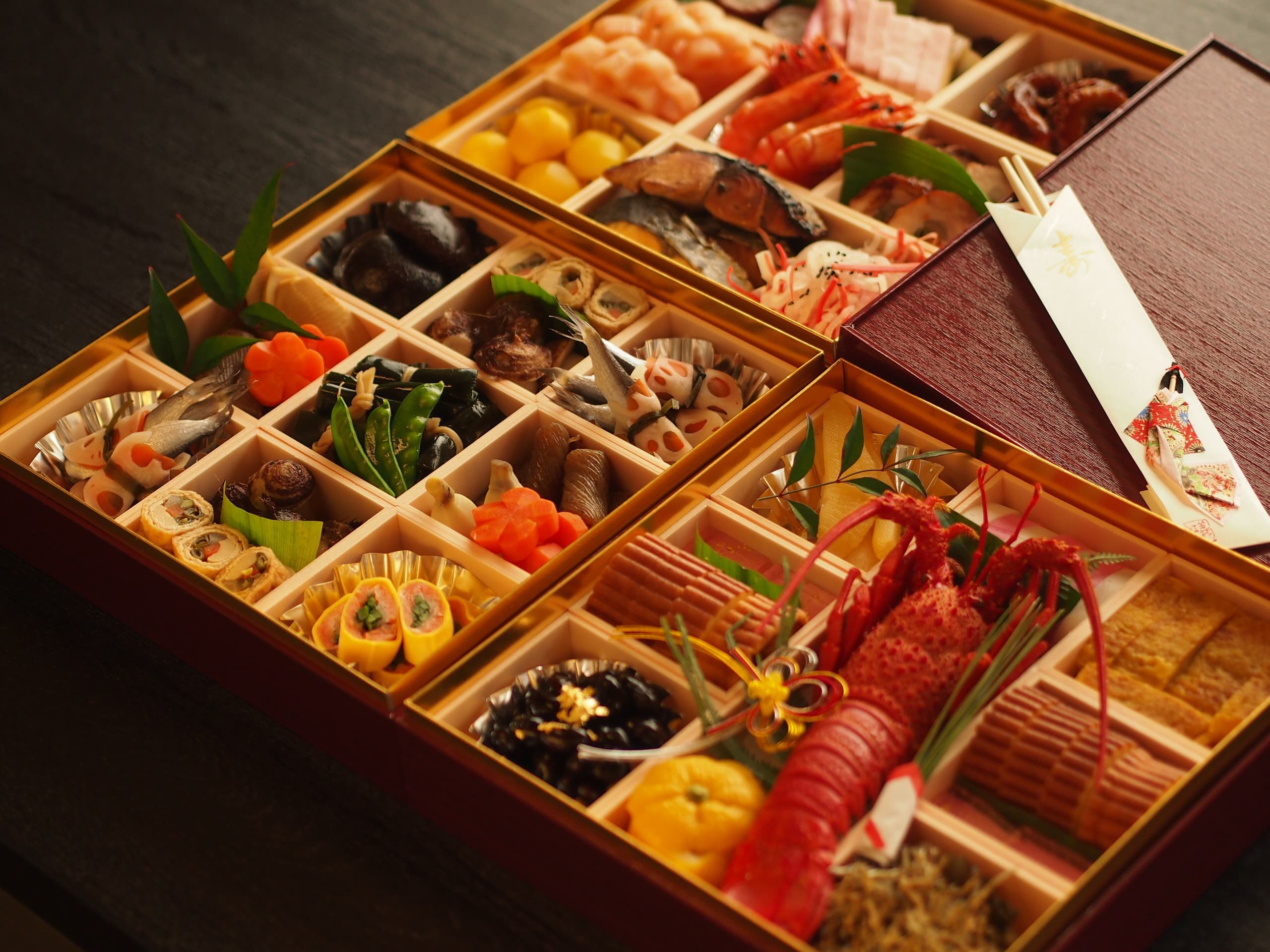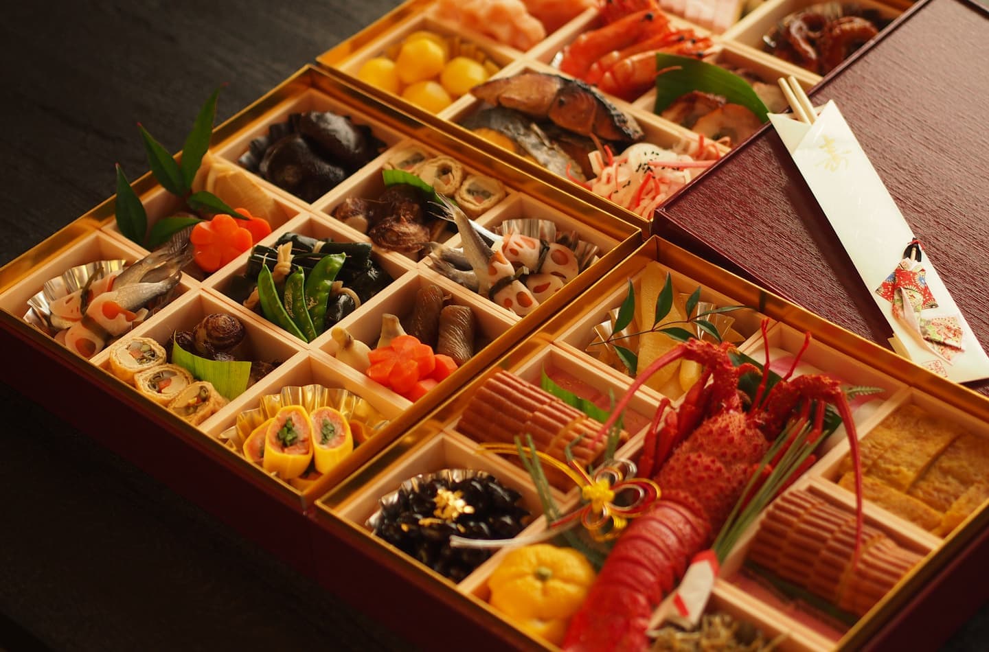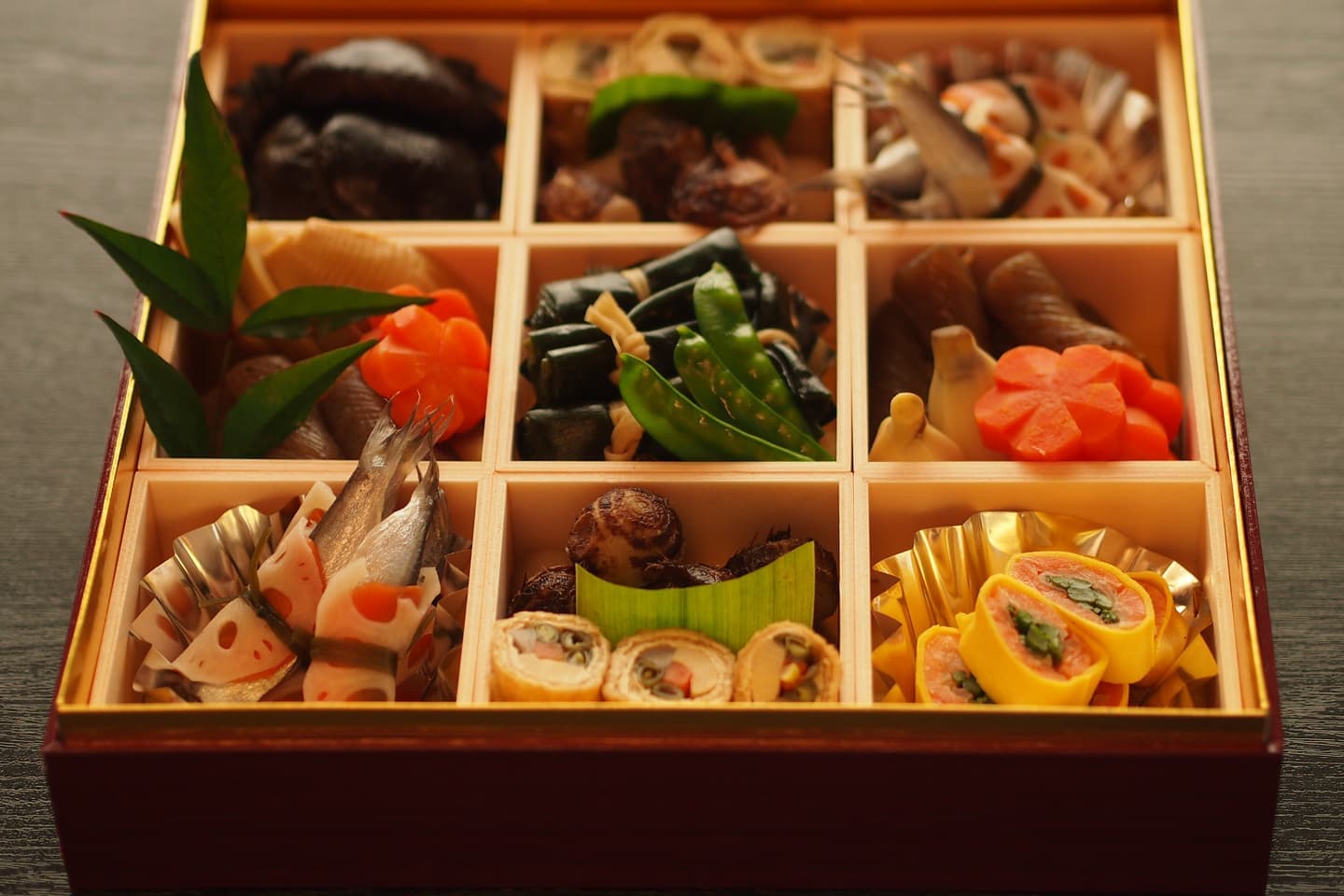 丁寧に仕込んだ食材を、特注紙器にギュッと詰め込みました。フタを開けると鮮やかな色彩が目に飛び込みます。みんなの笑顔で自然と箸がすすみ、新年の食卓が華やぎます。