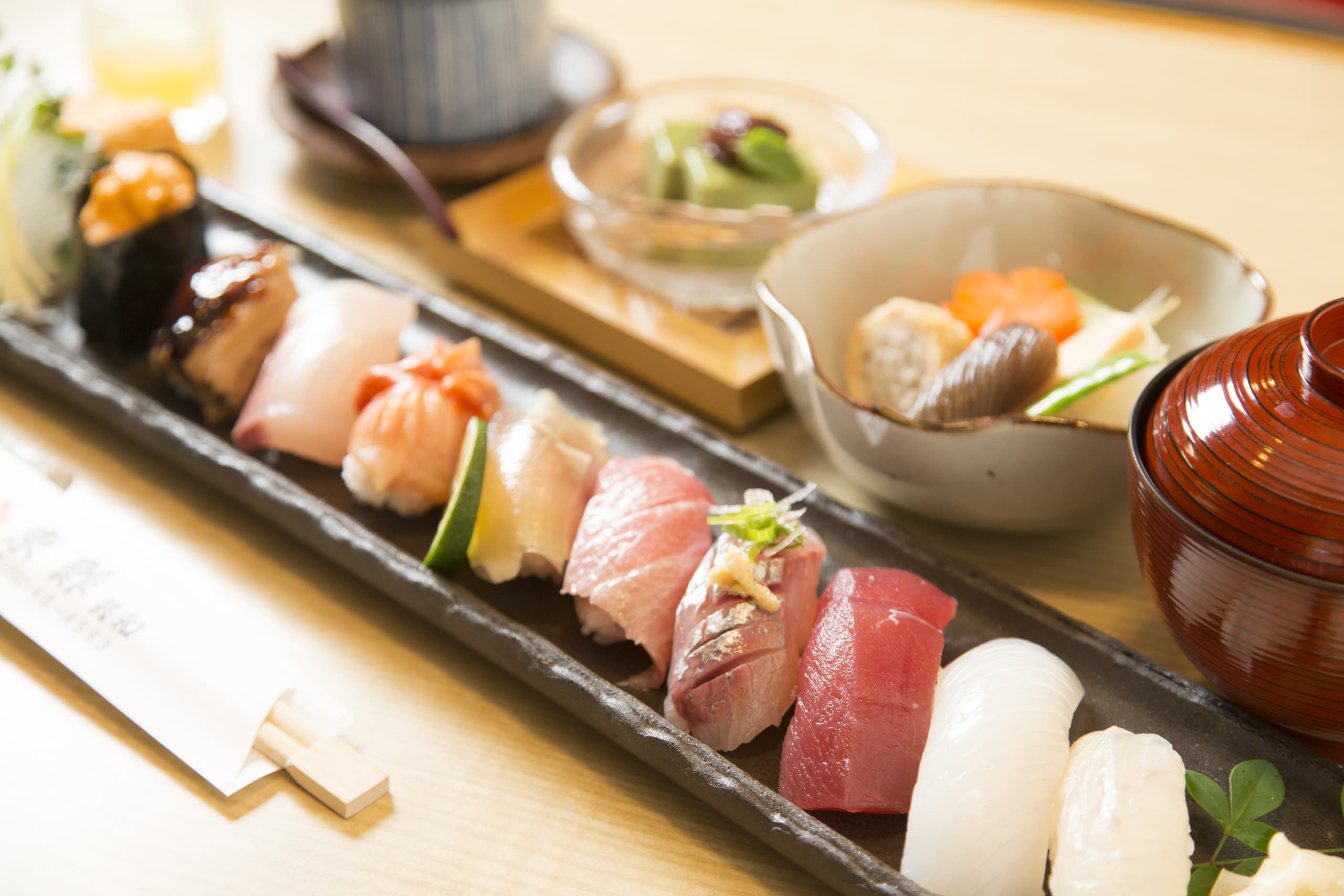 自家製漬けタレに漬け込んだ「ねっとり濃厚な赤身」は、当店こだわりの「シャリ」と相性抜群です。1番人気ネタの鮪赤身を贅沢に盛り付けます。 【ミニ天ぷら/小鉢1品/茶碗蒸し/汁もの/デザート】 2,250円(税込2,475円)