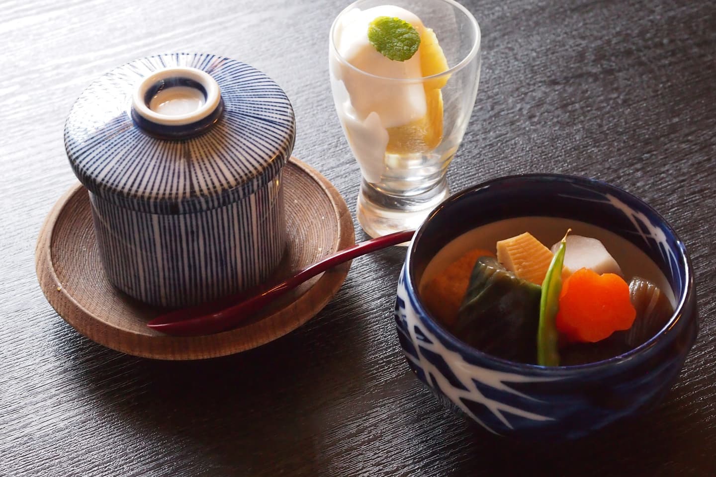 自家製漬けタレに漬け込んだ「ねっとり濃厚な赤身」と「ふんわり煮上げた穴子」を盛り込みました。一口二口と頬張れば、納得のハーモニーです。 【ミニ天ぷら/小鉢1品/茶碗蒸し/汁もの/デザート】 2,350円(税込2,585円)