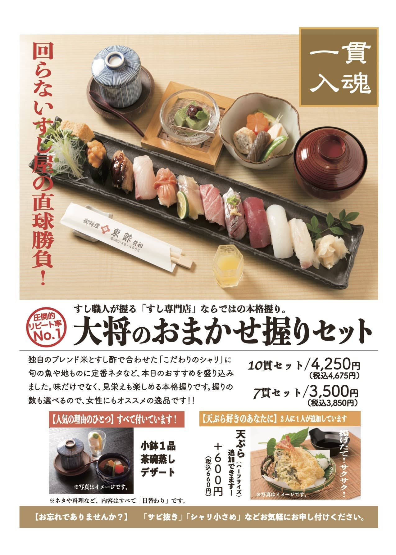 10貫セット...4,250円(税込4,675円)/10貫セット(ミニ天ぷら付き)...4,850円(税込5,335円)